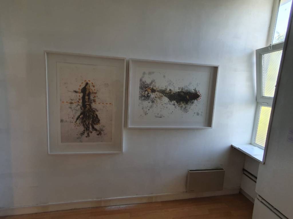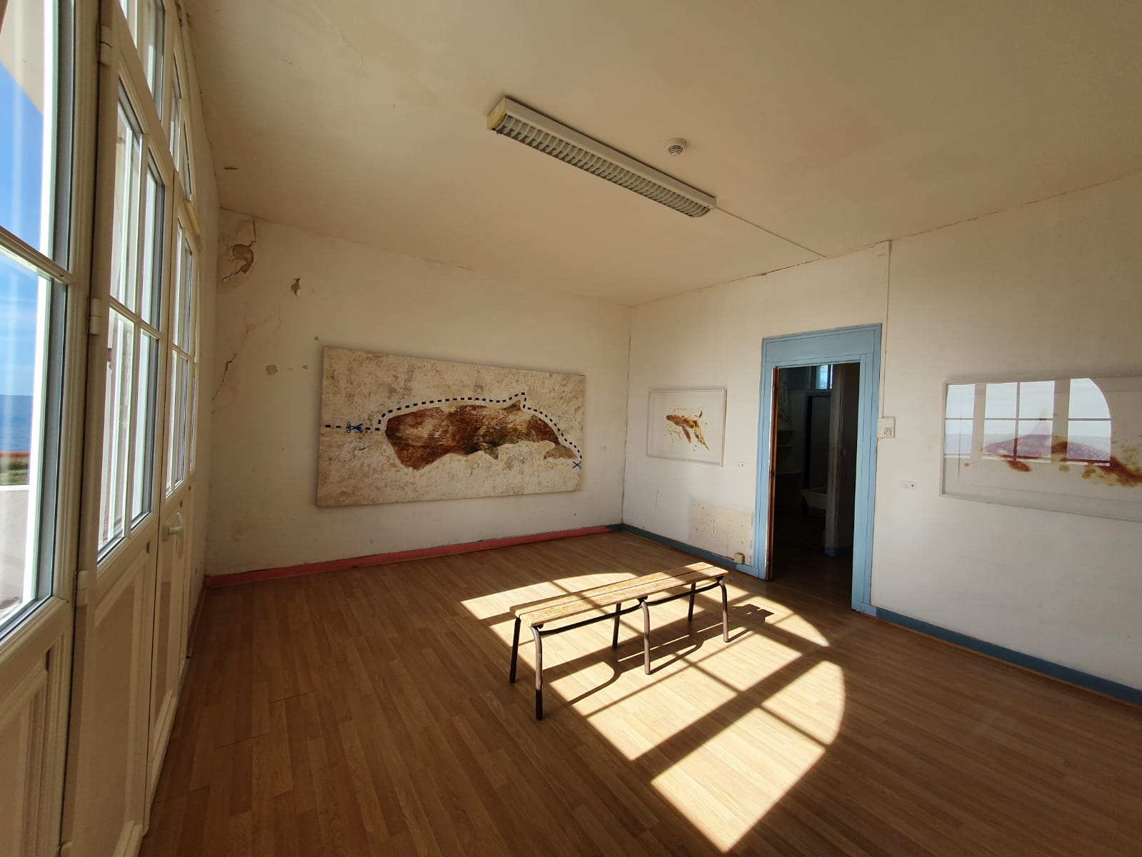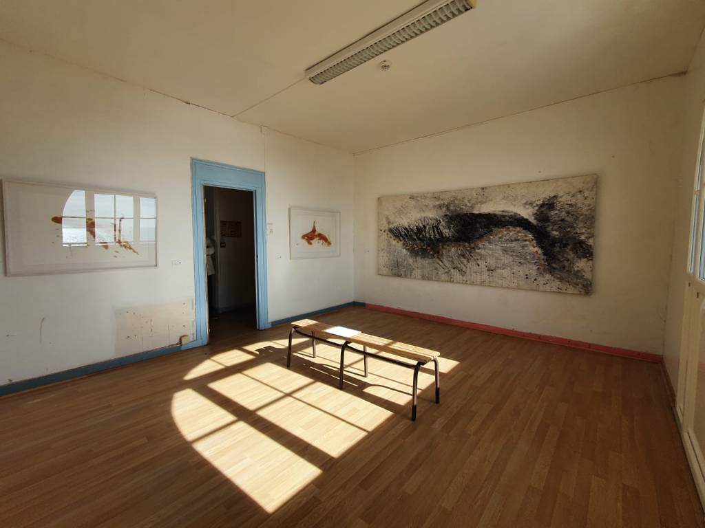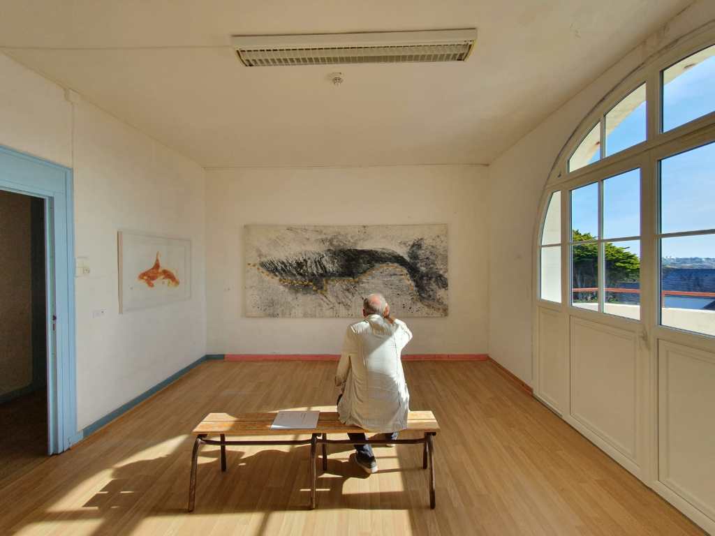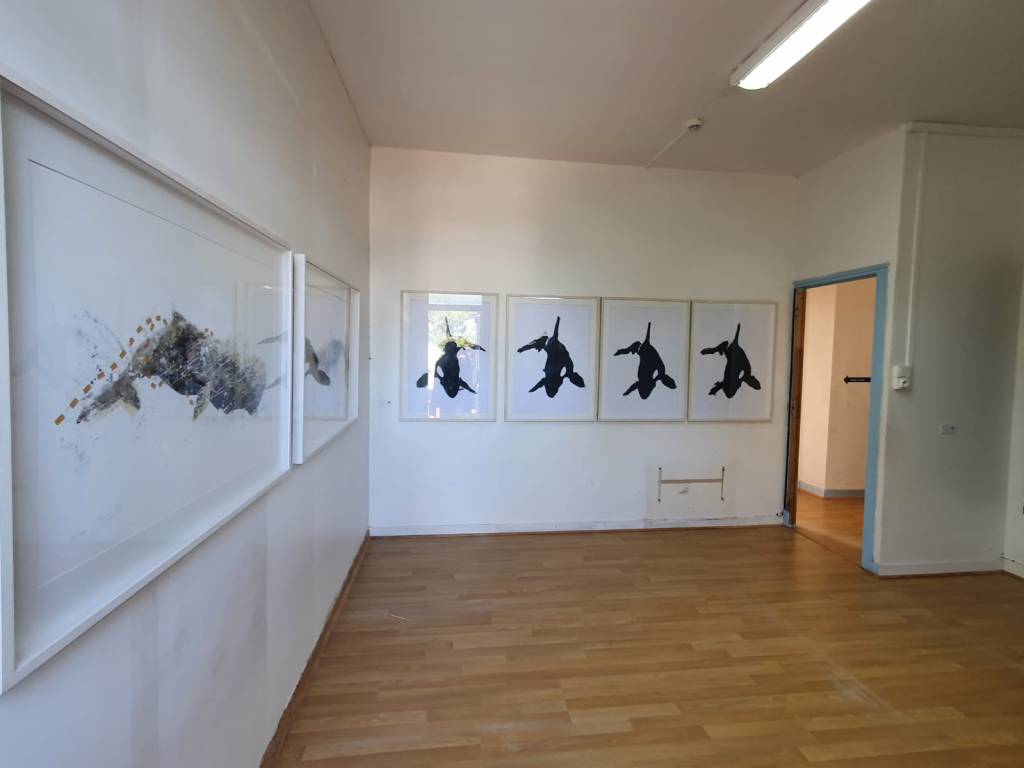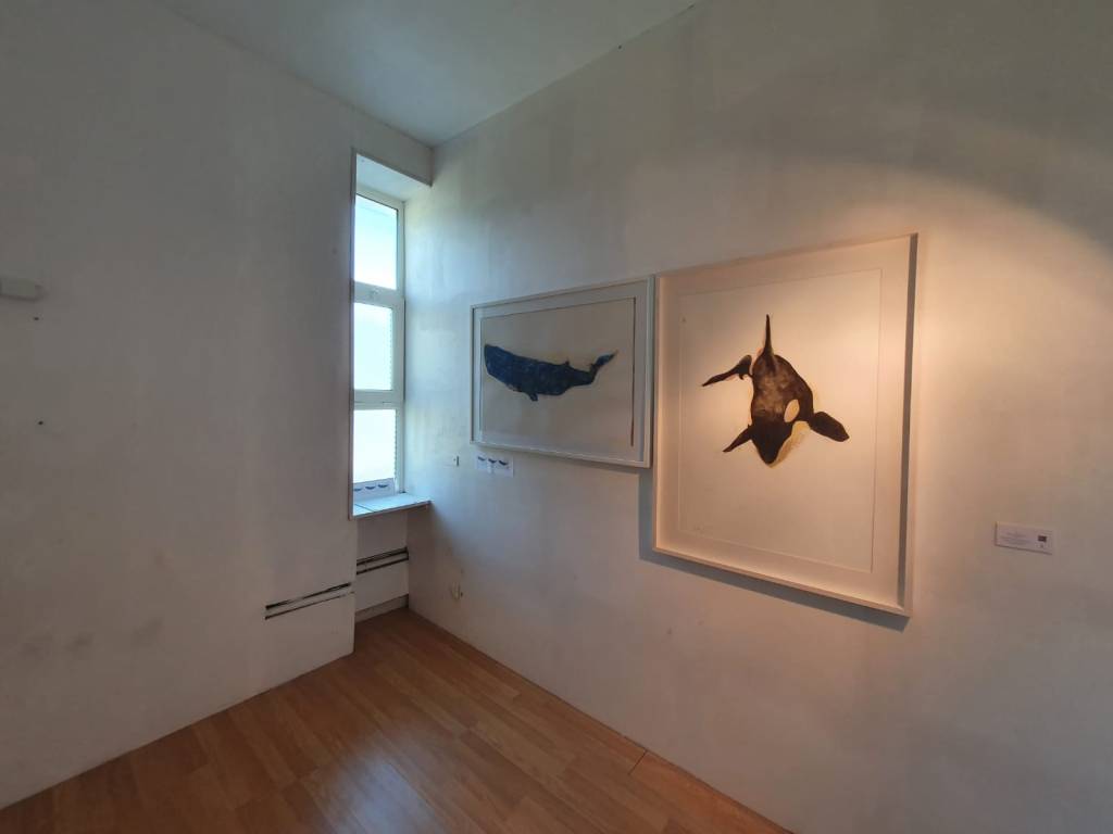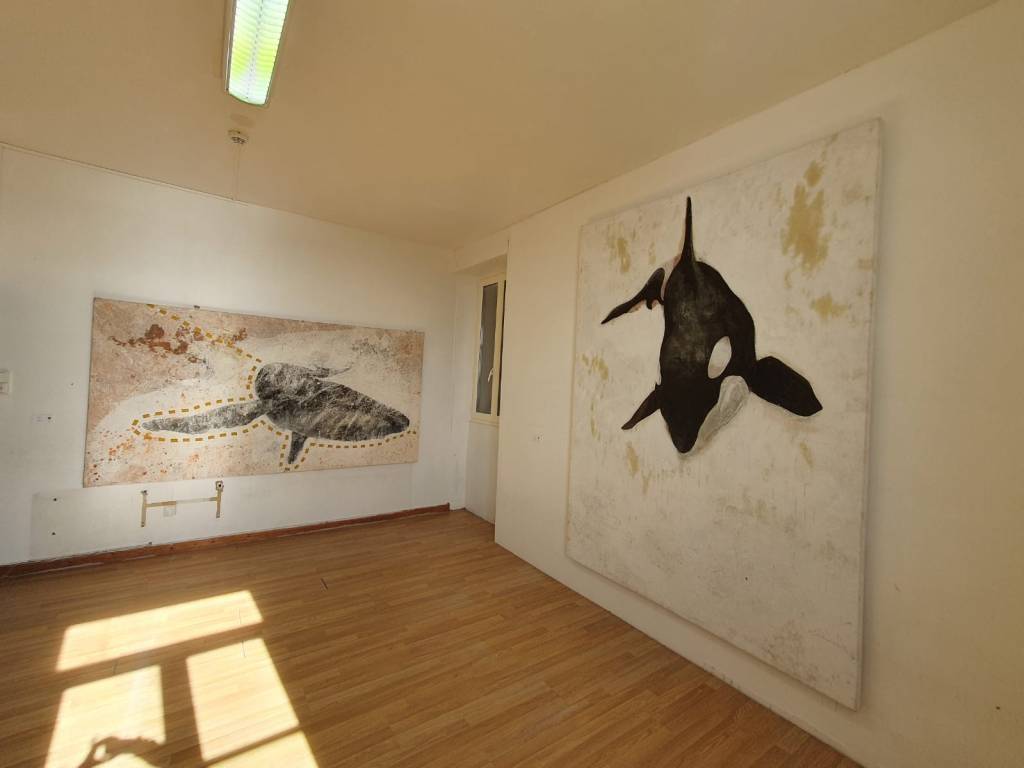 Seis pinturas de gran formato (algunas superan los 3m) y diez obras sobre papel componen esta suite que recibe a los visitantes y los sumerge en la temática marina de los cetáceos.